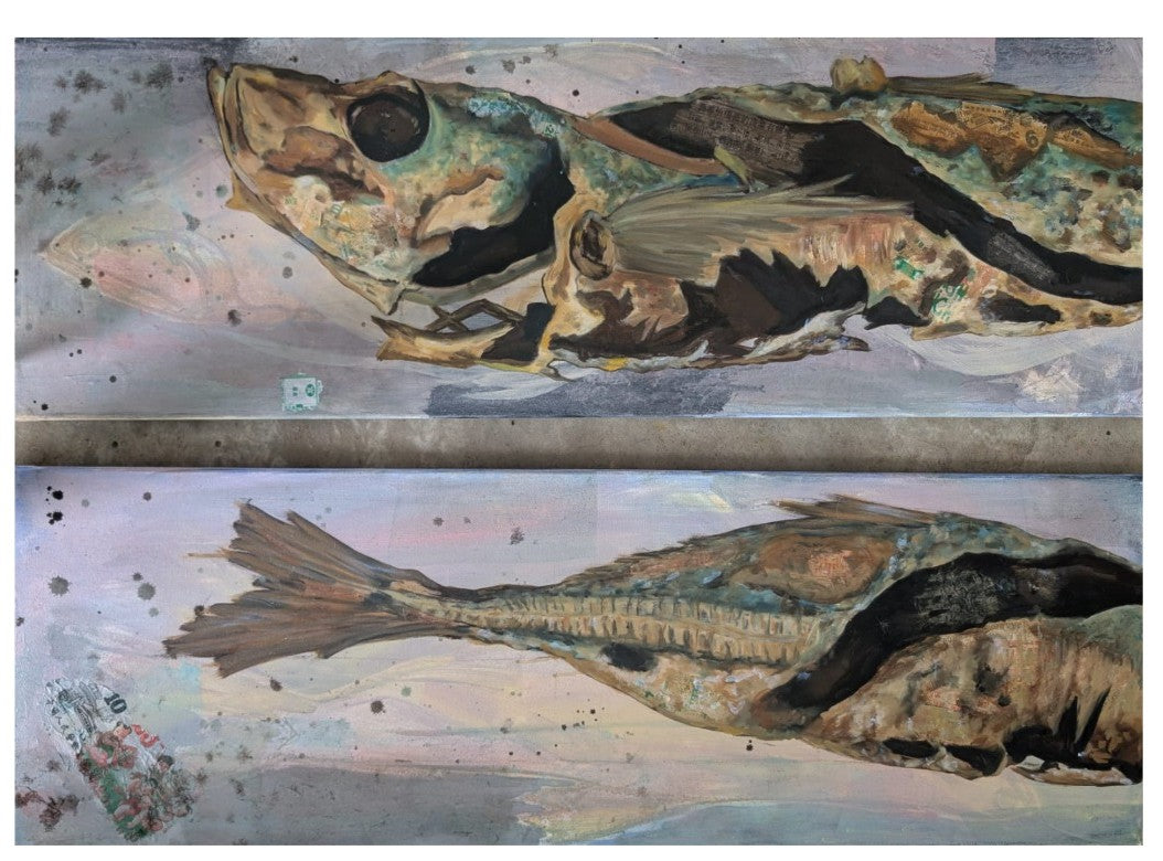 Through a sustained visual language of fish and embedded human traces, the works invite a sensory and temporal encounter where private emotion finds shared resonance.